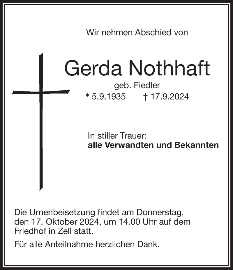 Hier finden Sie alle Traueranzeigen aus der Zeitung, die bisher für Gerda Nothaft erschienen sind. Weitere Traueranzeigen, die in der Zeitung erscheinen, werden hier ebenfalls aufgelistet