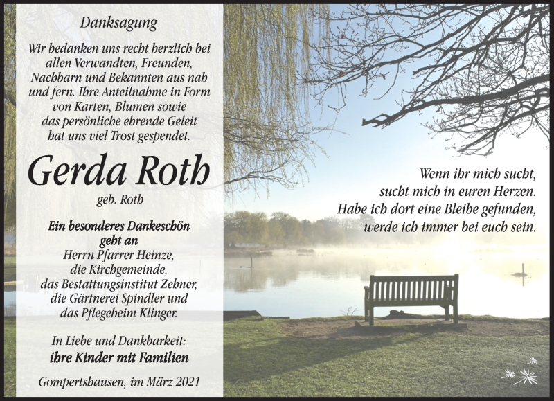 Hier finden Sie alle Traueranzeigen aus der Zeitung, die bisher für Gerda Roth erschienen sind. Weitere Traueranzeigen, die in der Zeitung erscheinen, werden hier ebenfalls aufgelistet