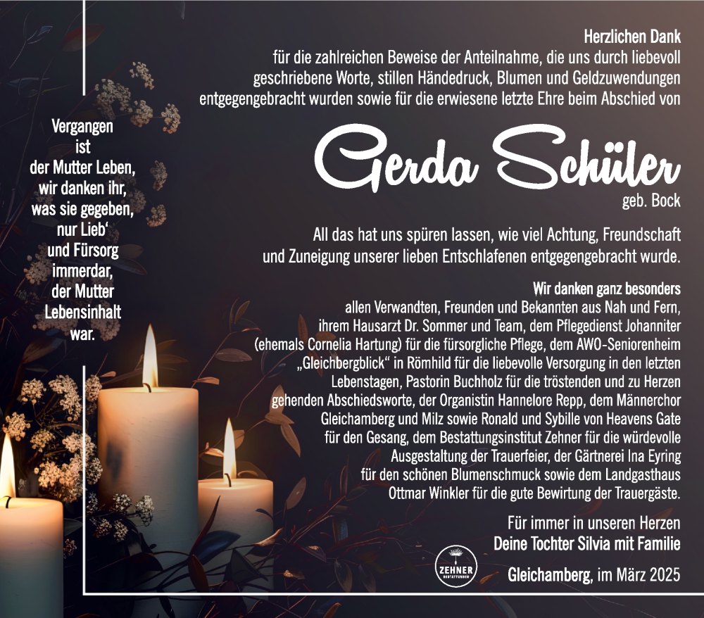 Hier finden Sie alle Traueranzeigen aus der Zeitung, die bisher für Gerda Schüler erschienen sind. Weitere Traueranzeigen, die in der Zeitung erscheinen, werden hier ebenfalls aufgelistet