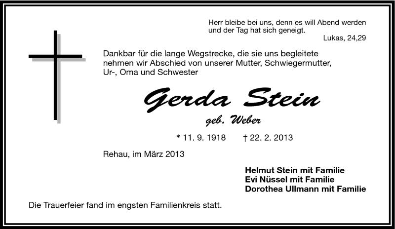 Hier finden Sie alle Traueranzeigen aus der Zeitung, die bisher für Gerda Stein erschienen sind. Weitere Traueranzeigen, die in der Zeitung erscheinen, werden hier ebenfalls aufgelistet