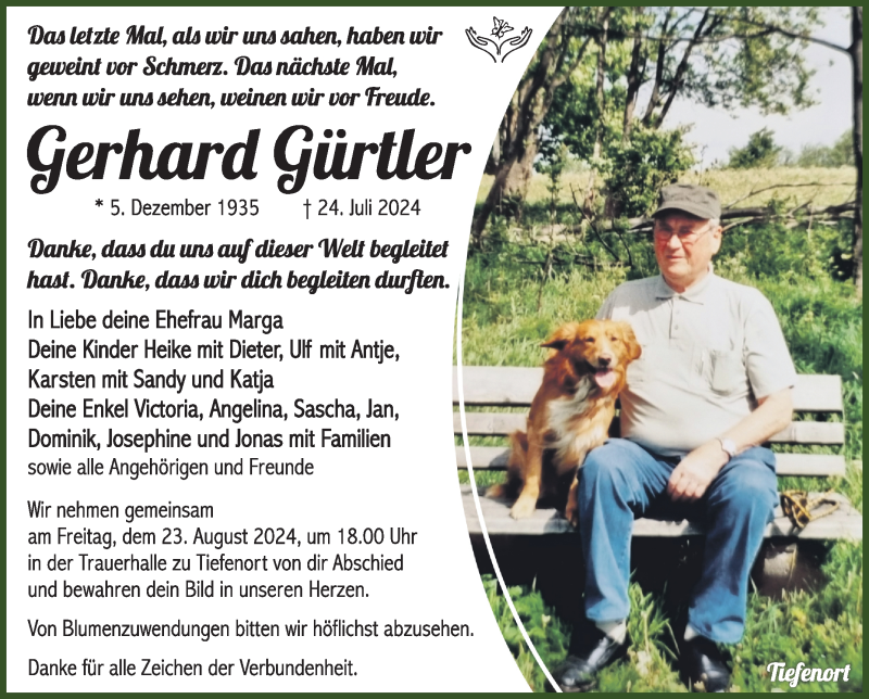 Hier finden Sie alle Traueranzeigen aus der Zeitung, die bisher für Gerhard Gürtler erschienen sind. Weitere Traueranzeigen, die in der Zeitung erscheinen, werden hier ebenfalls aufgelistet