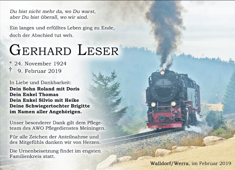 Hier finden Sie alle Traueranzeigen aus der Zeitung, die bisher für Gerhard Leser erschienen sind. Weitere Traueranzeigen, die in der Zeitung erscheinen, werden hier ebenfalls aufgelistet