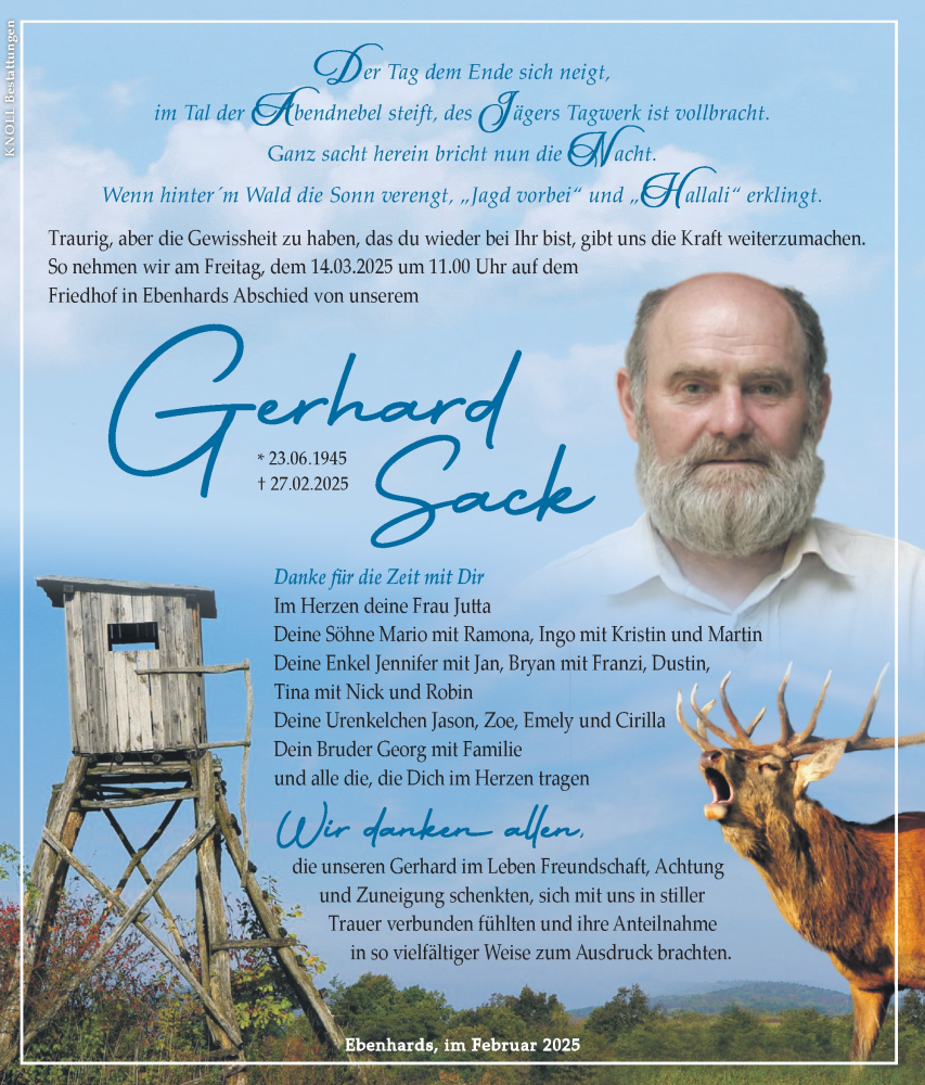 Hier finden Sie alle Traueranzeigen aus der Zeitung, die bisher für Gerhard Sack erschienen sind. Weitere Traueranzeigen, die in der Zeitung erscheinen, werden hier ebenfalls aufgelistet