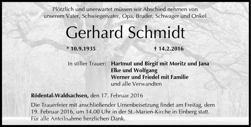 Hier finden Sie alle Traueranzeigen aus der Zeitung, die bisher für Gerhard Schmidt erschienen sind. Weitere Traueranzeigen, die in der Zeitung erscheinen, werden hier ebenfalls aufgelistet
