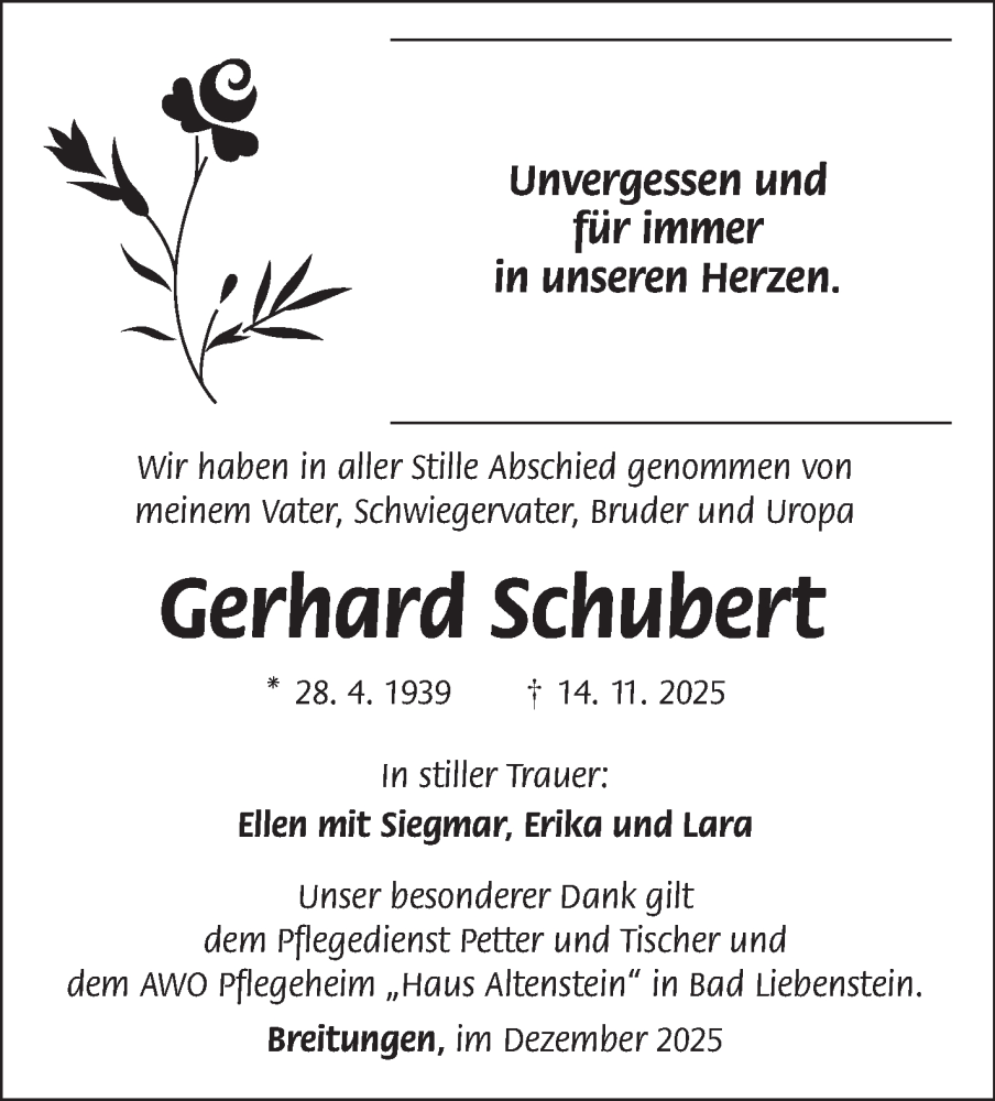 Hier finden Sie alle Traueranzeigen aus der Zeitung, die bisher für Gerhard Schubert erschienen sind. Weitere Traueranzeigen, die in der Zeitung erscheinen, werden hier ebenfalls aufgelistet