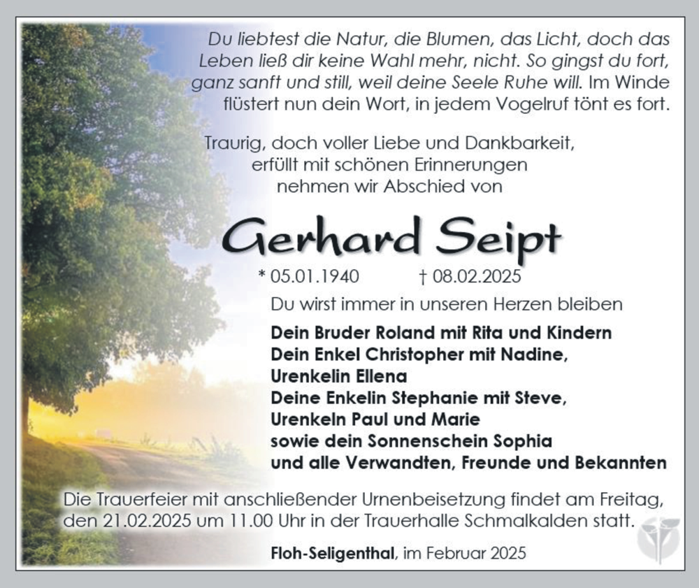 Hier finden Sie alle Traueranzeigen aus der Zeitung, die bisher für Gerhard Seipt erschienen sind. Weitere Traueranzeigen, die in der Zeitung erscheinen, werden hier ebenfalls aufgelistet