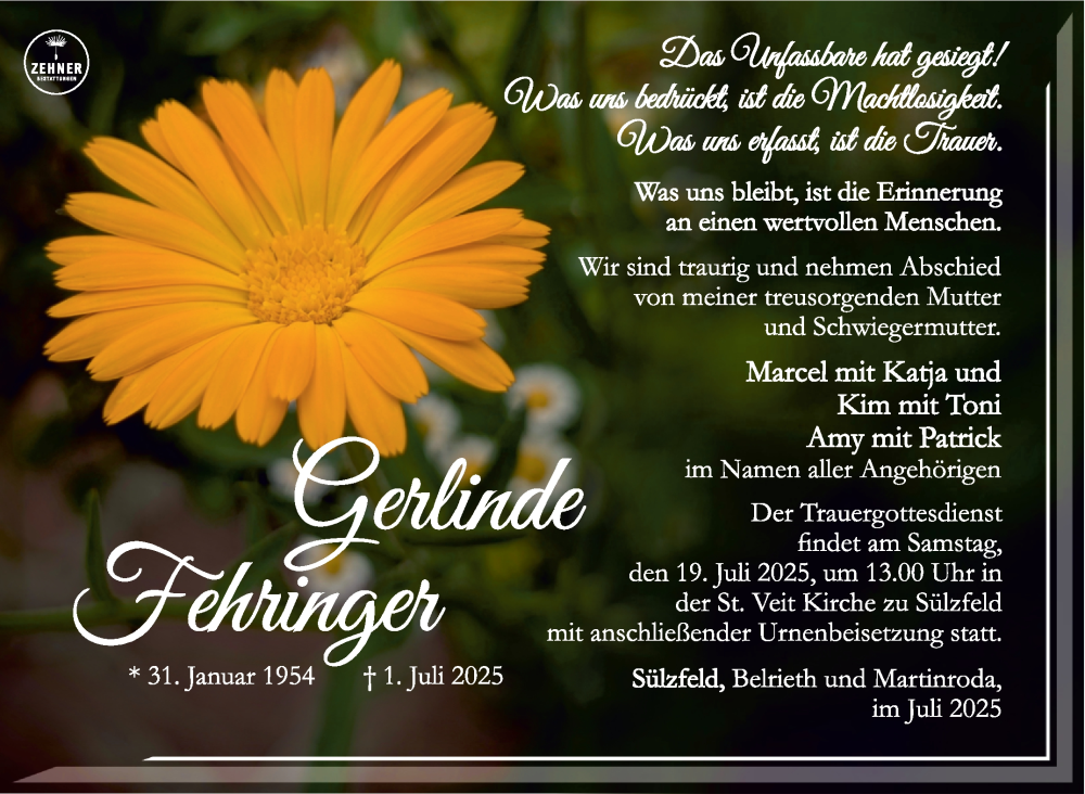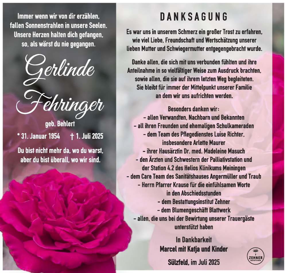 Hier finden Sie alle Traueranzeigen aus der Zeitung, die bisher für Gerlinde Fehringer erschienen sind. Weitere Traueranzeigen, die in der Zeitung erscheinen, werden hier ebenfalls aufgelistet