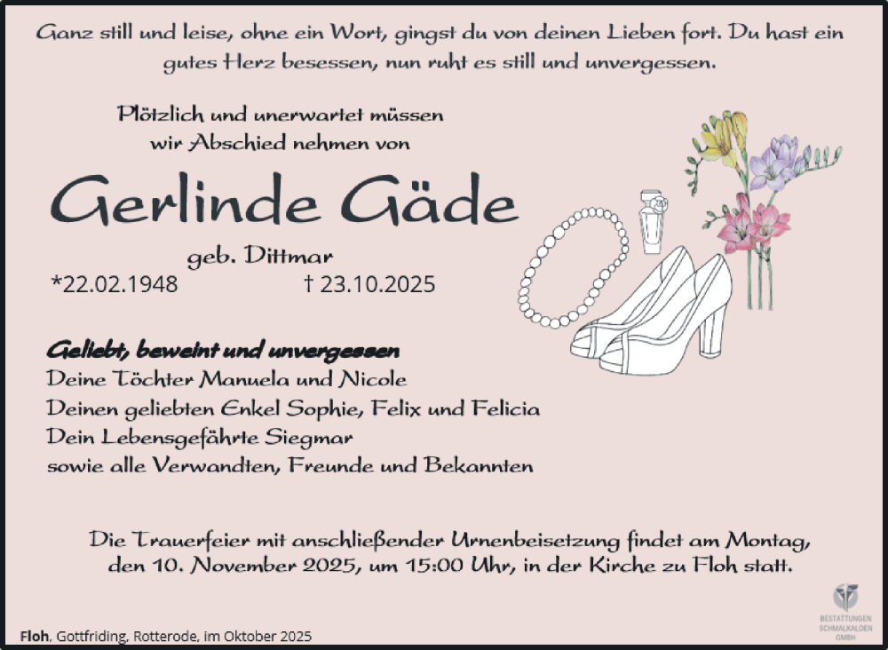 Hier finden Sie alle Traueranzeigen aus der Zeitung, die bisher für Gerlinde Gäde erschienen sind. Weitere Traueranzeigen, die in der Zeitung erscheinen, werden hier ebenfalls aufgelistet