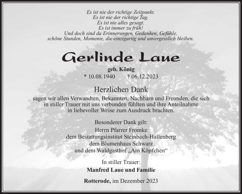 Hier finden Sie alle Traueranzeigen aus der Zeitung, die bisher für Gerlinde Laue erschienen sind. Weitere Traueranzeigen, die in der Zeitung erscheinen, werden hier ebenfalls aufgelistet