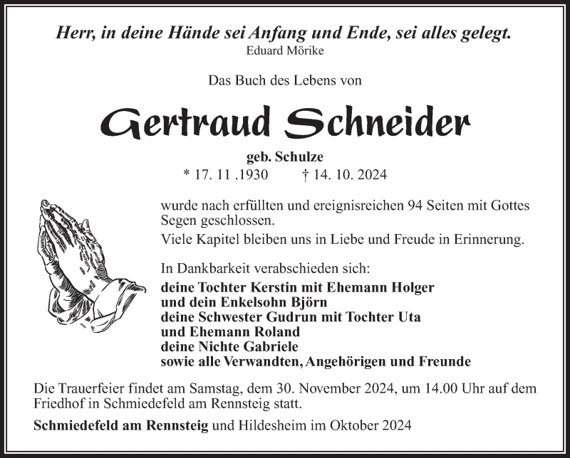 Hier finden Sie alle Traueranzeigen aus der Zeitung, die bisher für Gertraud Schneider erschienen sind. Weitere Traueranzeigen, die in der Zeitung erscheinen, werden hier ebenfalls aufgelistet