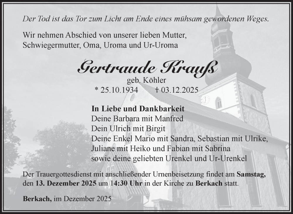 Hier finden Sie alle Traueranzeigen aus der Zeitung, die bisher für Gertraude Krauß erschienen sind. Weitere Traueranzeigen, die in der Zeitung erscheinen, werden hier ebenfalls aufgelistet