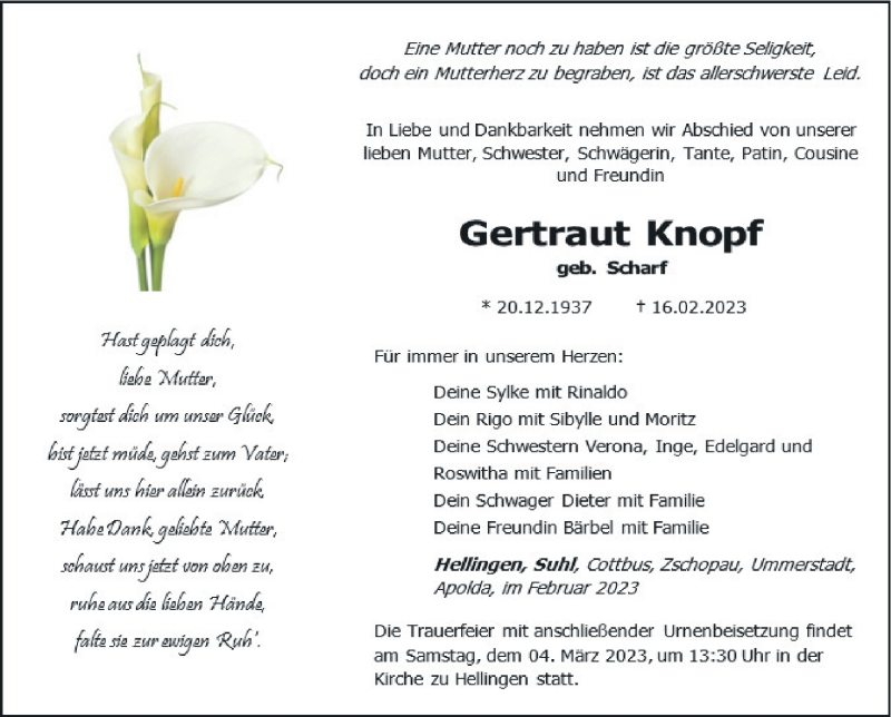 Hier finden Sie alle Traueranzeigen aus der Zeitung, die bisher für Gertraut Knopf erschienen sind. Weitere Traueranzeigen, die in der Zeitung erscheinen, werden hier ebenfalls aufgelistet