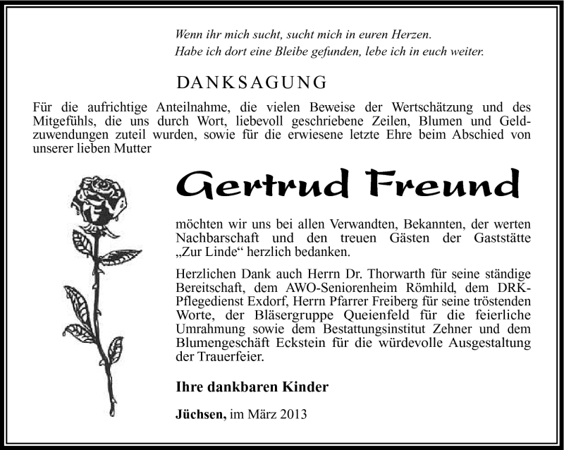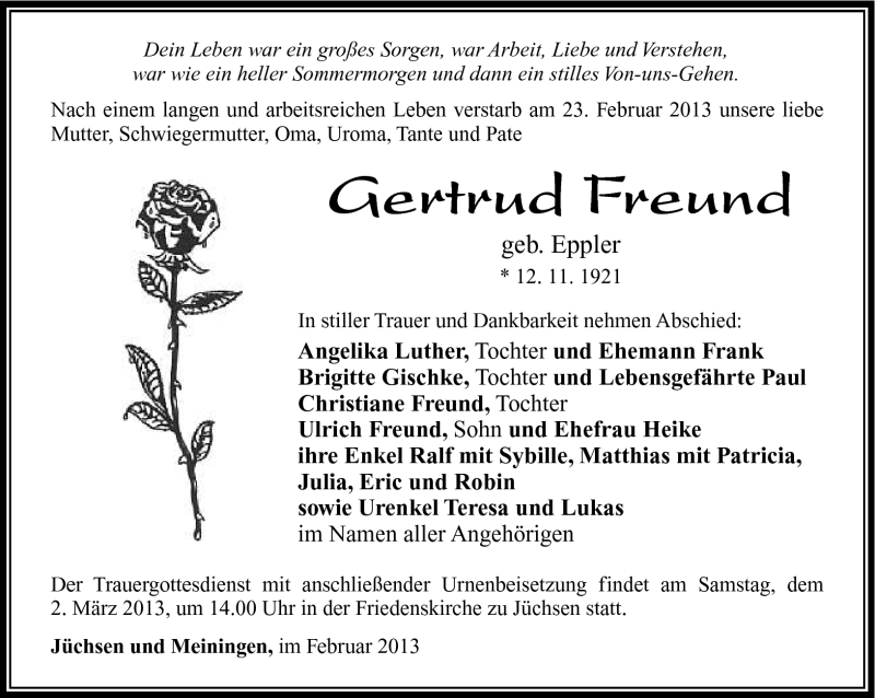 Hier finden Sie alle Traueranzeigen aus der Zeitung, die bisher für Gertrud Freund erschienen sind. Weitere Traueranzeigen, die in der Zeitung erscheinen, werden hier ebenfalls aufgelistet