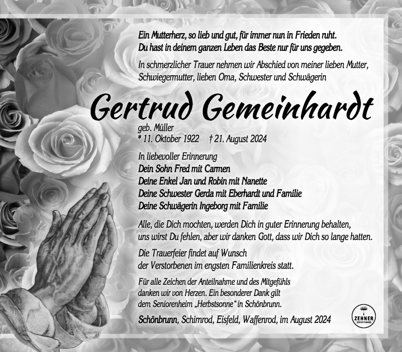 Hier finden Sie alle Traueranzeigen aus der Zeitung, die bisher für Gertrud Gemeinhardt erschienen sind. Weitere Traueranzeigen, die in der Zeitung erscheinen, werden hier ebenfalls aufgelistet