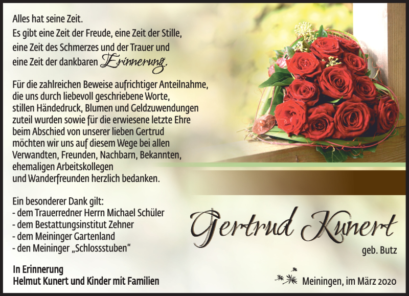 Hier finden Sie alle Traueranzeigen aus der Zeitung, die bisher für Gertrud Kunert erschienen sind. Weitere Traueranzeigen, die in der Zeitung erscheinen, werden hier ebenfalls aufgelistet