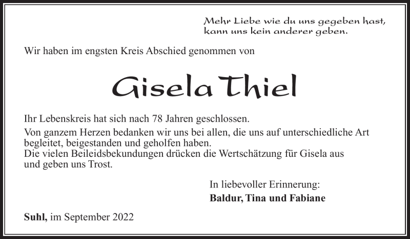 Hier finden Sie alle Traueranzeigen aus der Zeitung, die bisher für Giesela Thiel erschienen sind. Weitere Traueranzeigen, die in der Zeitung erscheinen, werden hier ebenfalls aufgelistet