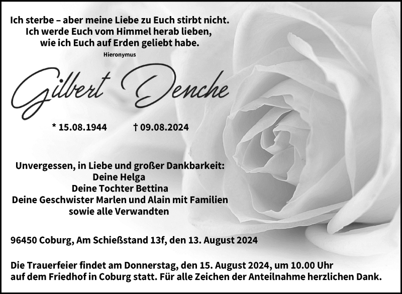 Hier finden Sie alle Traueranzeigen aus der Zeitung, die bisher für Gilbert Denche erschienen sind. Weitere Traueranzeigen, die in der Zeitung erscheinen, werden hier ebenfalls aufgelistet