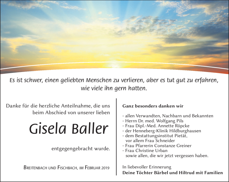 Hier finden Sie alle Traueranzeigen aus der Zeitung, die bisher für Gisela Baller erschienen sind. Weitere Traueranzeigen, die in der Zeitung erscheinen, werden hier ebenfalls aufgelistet