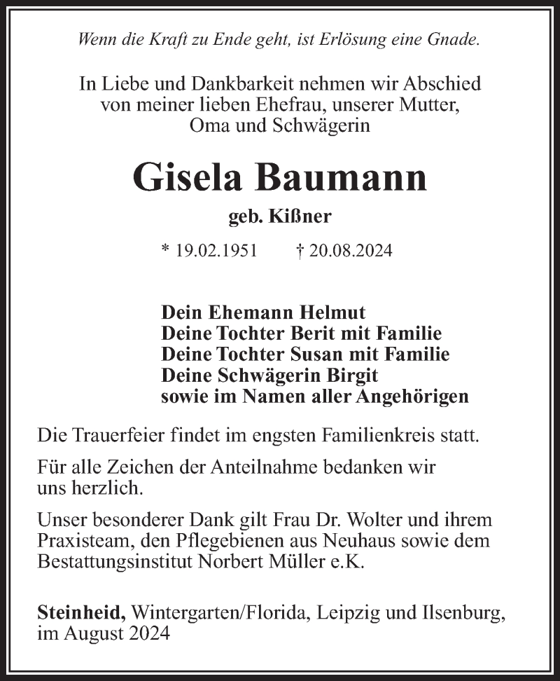 Hier finden Sie alle Traueranzeigen aus der Zeitung, die bisher für Gisela Baumann erschienen sind. Weitere Traueranzeigen, die in der Zeitung erscheinen, werden hier ebenfalls aufgelistet