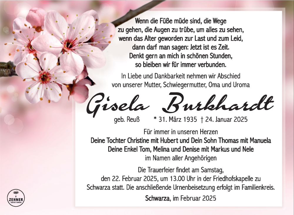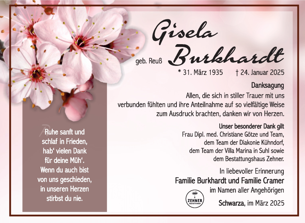 Hier finden Sie alle Traueranzeigen aus der Zeitung, die bisher für Gisela Burkhardt erschienen sind. Weitere Traueranzeigen, die in der Zeitung erscheinen, werden hier ebenfalls aufgelistet