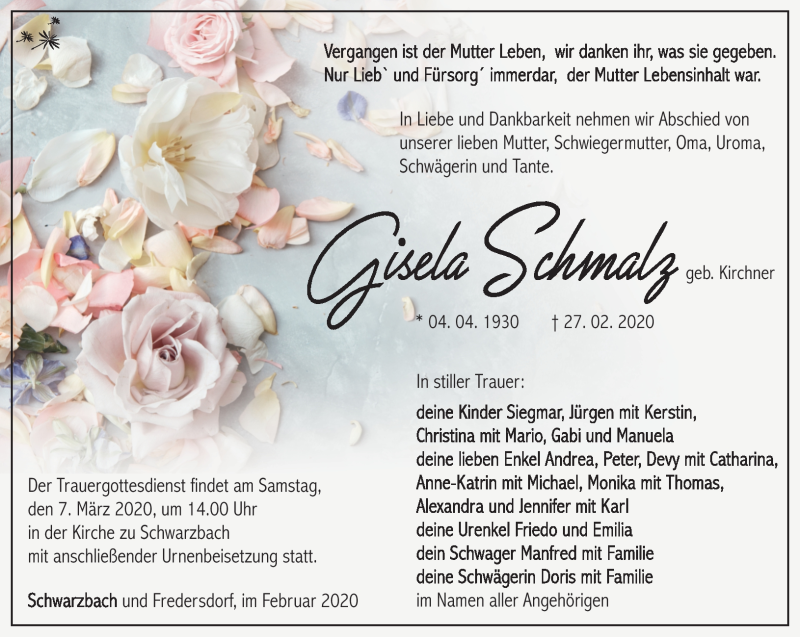 Hier finden Sie alle Traueranzeigen aus der Zeitung, die bisher für Gisela Schmalz erschienen sind. Weitere Traueranzeigen, die in der Zeitung erscheinen, werden hier ebenfalls aufgelistet