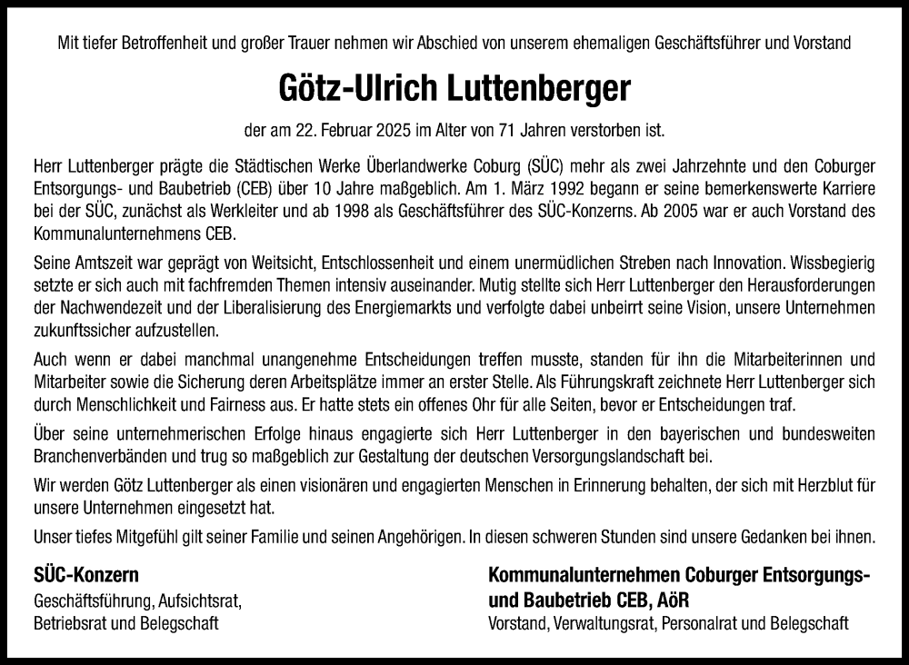 Hier finden Sie alle Traueranzeigen aus der Zeitung, die bisher für Götz-Ulrich Luttenberger erschienen sind. Weitere Traueranzeigen, die in der Zeitung erscheinen, werden hier ebenfalls aufgelistet
