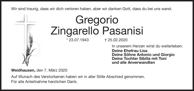 Hier finden Sie alle Traueranzeigen aus der Zeitung, die bisher für Gregorio Zingarello Pasanisi erschienen sind. Weitere Traueranzeigen, die in der Zeitung erscheinen, werden hier ebenfalls aufgelistet