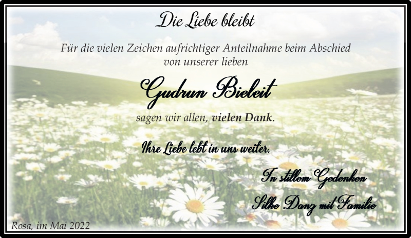 Hier finden Sie alle Traueranzeigen aus der Zeitung, die bisher für Gudrun Bieleit erschienen sind. Weitere Traueranzeigen, die in der Zeitung erscheinen, werden hier ebenfalls aufgelistet