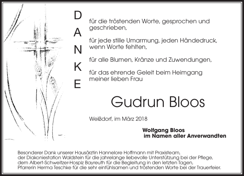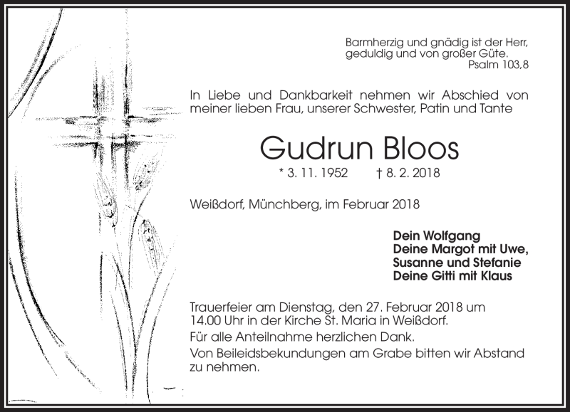 Hier finden Sie alle Traueranzeigen aus der Zeitung, die bisher für Gudrun Bloos erschienen sind. Weitere Traueranzeigen, die in der Zeitung erscheinen, werden hier ebenfalls aufgelistet