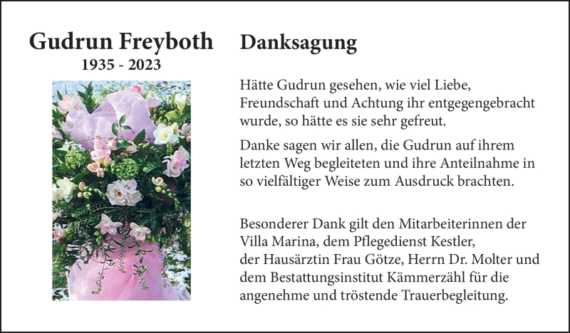 Hier finden Sie alle Traueranzeigen aus der Zeitung, die bisher für Gudrun Freyboth erschienen sind. Weitere Traueranzeigen, die in der Zeitung erscheinen, werden hier ebenfalls aufgelistet