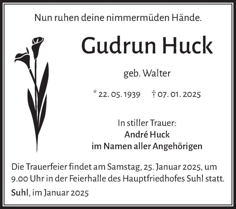 Hier finden Sie alle Traueranzeigen aus der Zeitung, die bisher für Gudrun Huck erschienen sind. Weitere Traueranzeigen, die in der Zeitung erscheinen, werden hier ebenfalls aufgelistet