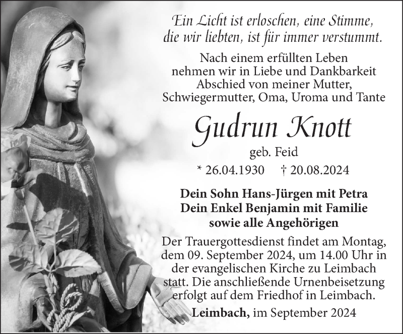 Hier finden Sie alle Traueranzeigen aus der Zeitung, die bisher für Gudrun Knott erschienen sind. Weitere Traueranzeigen, die in der Zeitung erscheinen, werden hier ebenfalls aufgelistet