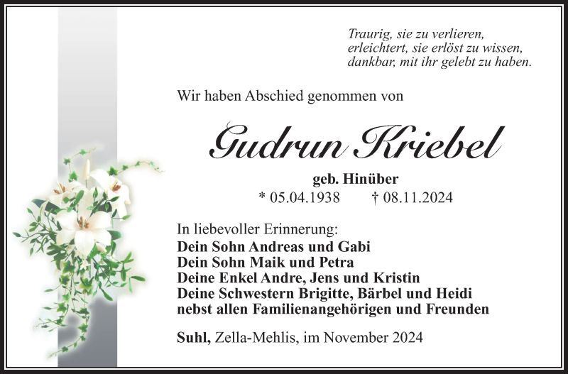 Hier finden Sie alle Traueranzeigen aus der Zeitung, die bisher für Gudrun Kriebel erschienen sind. Weitere Traueranzeigen, die in der Zeitung erscheinen, werden hier ebenfalls aufgelistet