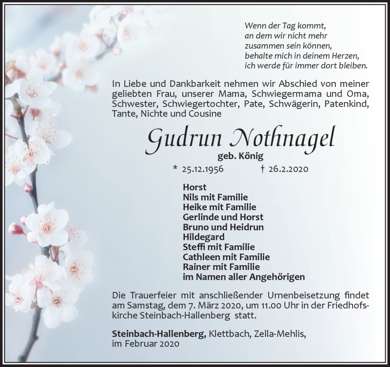 Hier finden Sie alle Traueranzeigen aus der Zeitung, die bisher für Gudrun Nothnagel erschienen sind. Weitere Traueranzeigen, die in der Zeitung erscheinen, werden hier ebenfalls aufgelistet