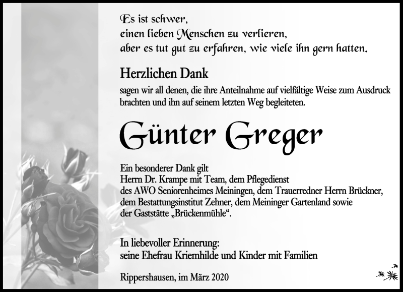 Hier finden Sie alle Traueranzeigen aus der Zeitung, die bisher für Günter Greger erschienen sind. Weitere Traueranzeigen, die in der Zeitung erscheinen, werden hier ebenfalls aufgelistet