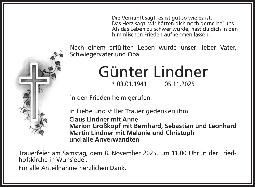 Hier finden Sie alle Traueranzeigen aus der Zeitung, die bisher für Günter Lindner erschienen sind. Weitere Traueranzeigen, die in der Zeitung erscheinen, werden hier ebenfalls aufgelistet
