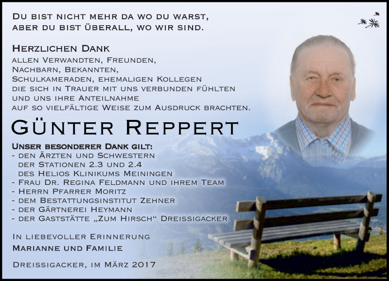 Hier finden Sie alle Traueranzeigen aus der Zeitung, die bisher für Günter Reppert erschienen sind. Weitere Traueranzeigen, die in der Zeitung erscheinen, werden hier ebenfalls aufgelistet