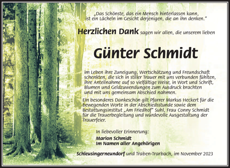 Hier finden Sie alle Traueranzeigen aus der Zeitung, die bisher für Günter Schmidt erschienen sind. Weitere Traueranzeigen, die in der Zeitung erscheinen, werden hier ebenfalls aufgelistet
