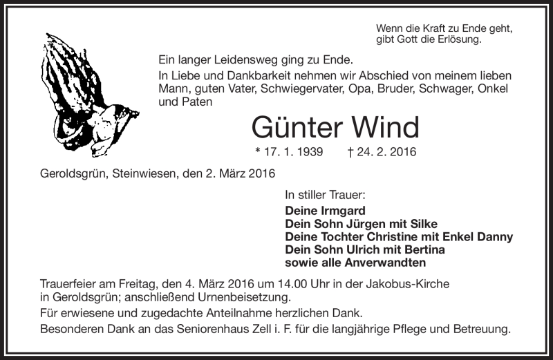 Hier finden Sie alle Traueranzeigen aus der Zeitung, die bisher für Günter Wind erschienen sind. Weitere Traueranzeigen, die in der Zeitung erscheinen, werden hier ebenfalls aufgelistet
