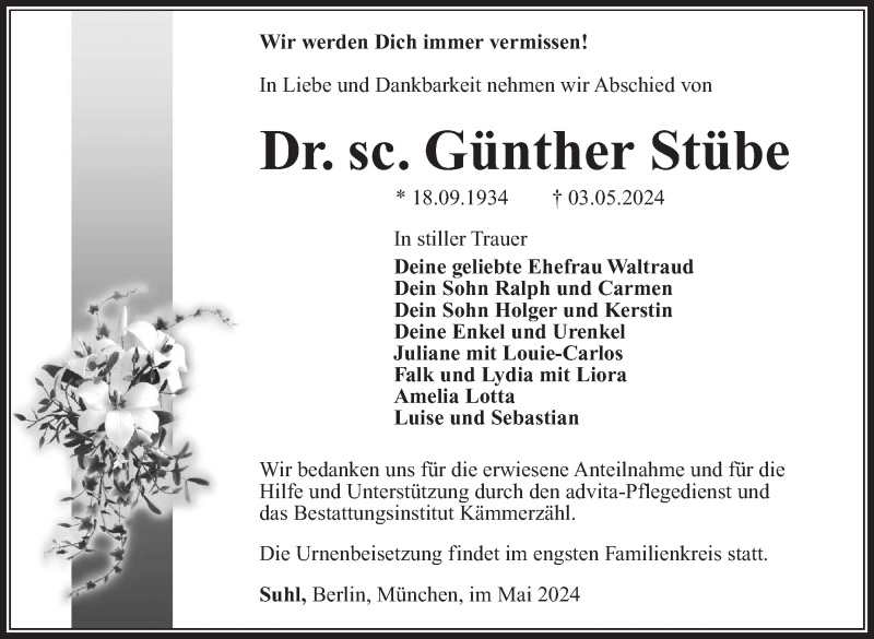 Hier finden Sie alle Traueranzeigen aus der Zeitung, die bisher für Günther Stübe erschienen sind. Weitere Traueranzeigen, die in der Zeitung erscheinen, werden hier ebenfalls aufgelistet