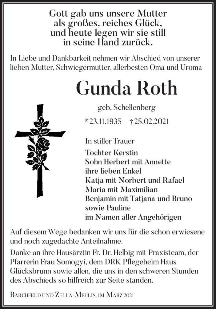 Hier finden Sie alle Traueranzeigen aus der Zeitung, die bisher für Gunda Roth erschienen sind. Weitere Traueranzeigen, die in der Zeitung erscheinen, werden hier ebenfalls aufgelistet