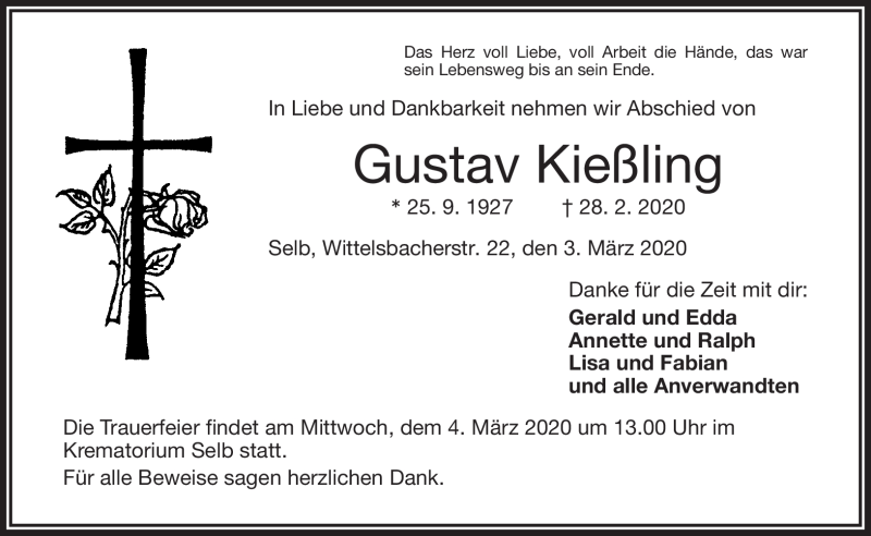 Hier finden Sie alle Traueranzeigen aus der Zeitung, die bisher für Gustav Kießling erschienen sind. Weitere Traueranzeigen, die in der Zeitung erscheinen, werden hier ebenfalls aufgelistet
