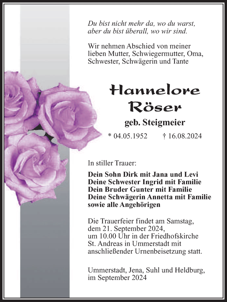 Hier finden Sie alle Traueranzeigen aus der Zeitung, die bisher für Hannelore Röser erschienen sind. Weitere Traueranzeigen, die in der Zeitung erscheinen, werden hier ebenfalls aufgelistet