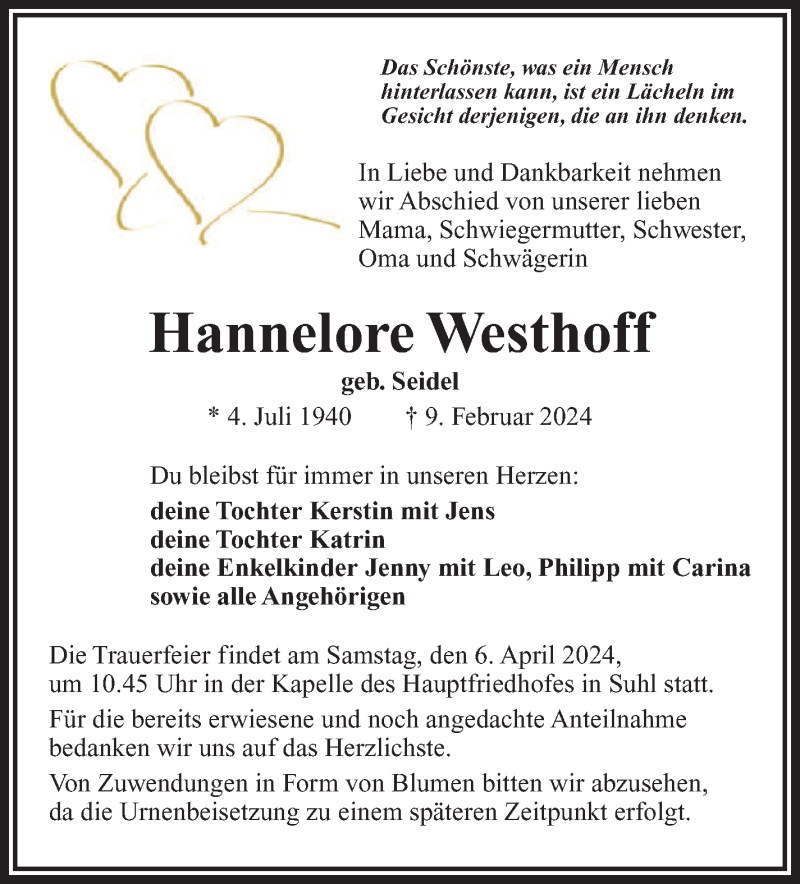 Hier finden Sie alle Traueranzeigen aus der Zeitung, die bisher für Hannelore Westhoff erschienen sind. Weitere Traueranzeigen, die in der Zeitung erscheinen, werden hier ebenfalls aufgelistet