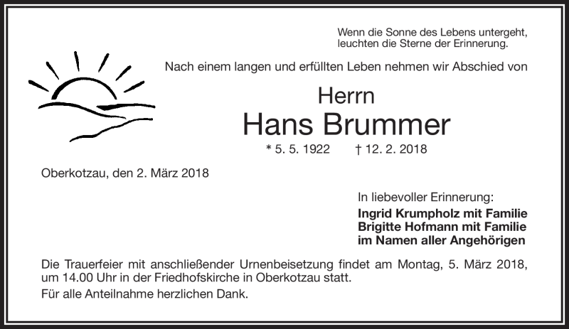 Hier finden Sie alle Traueranzeigen aus der Zeitung, die bisher für Hans Brummer erschienen sind. Weitere Traueranzeigen, die in der Zeitung erscheinen, werden hier ebenfalls aufgelistet