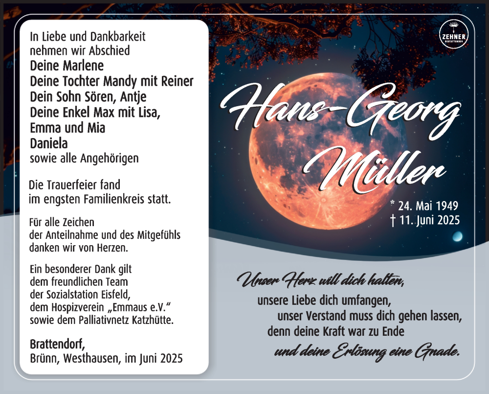 Hier finden Sie alle Traueranzeigen aus der Zeitung, die bisher für Hans-Georg Müller erschienen sind. Weitere Traueranzeigen, die in der Zeitung erscheinen, werden hier ebenfalls aufgelistet