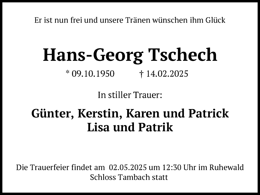 Hier finden Sie alle Traueranzeigen aus der Zeitung, die bisher für Hans-Georg Tschech erschienen sind. Weitere Traueranzeigen, die in der Zeitung erscheinen, werden hier ebenfalls aufgelistet