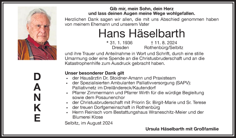 Hier finden Sie alle Traueranzeigen aus der Zeitung, die bisher für Hans Häselbarth erschienen sind. Weitere Traueranzeigen, die in der Zeitung erscheinen, werden hier ebenfalls aufgelistet