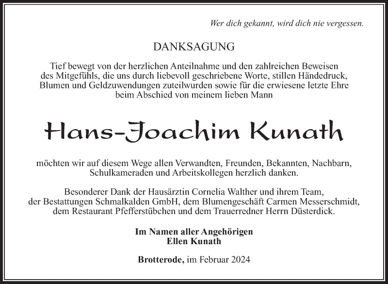 Hier finden Sie alle Traueranzeigen aus der Zeitung, die bisher für Hans-Joachim Kunath erschienen sind. Weitere Traueranzeigen, die in der Zeitung erscheinen, werden hier ebenfalls aufgelistet