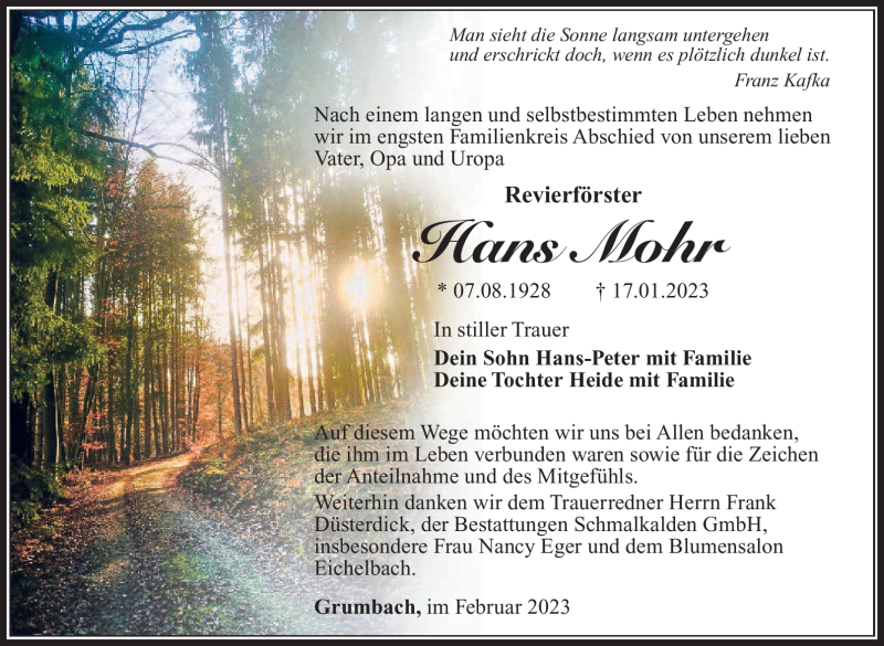 Hier finden Sie alle Traueranzeigen aus der Zeitung, die bisher für Hans Mohr erschienen sind. Weitere Traueranzeigen, die in der Zeitung erscheinen, werden hier ebenfalls aufgelistet